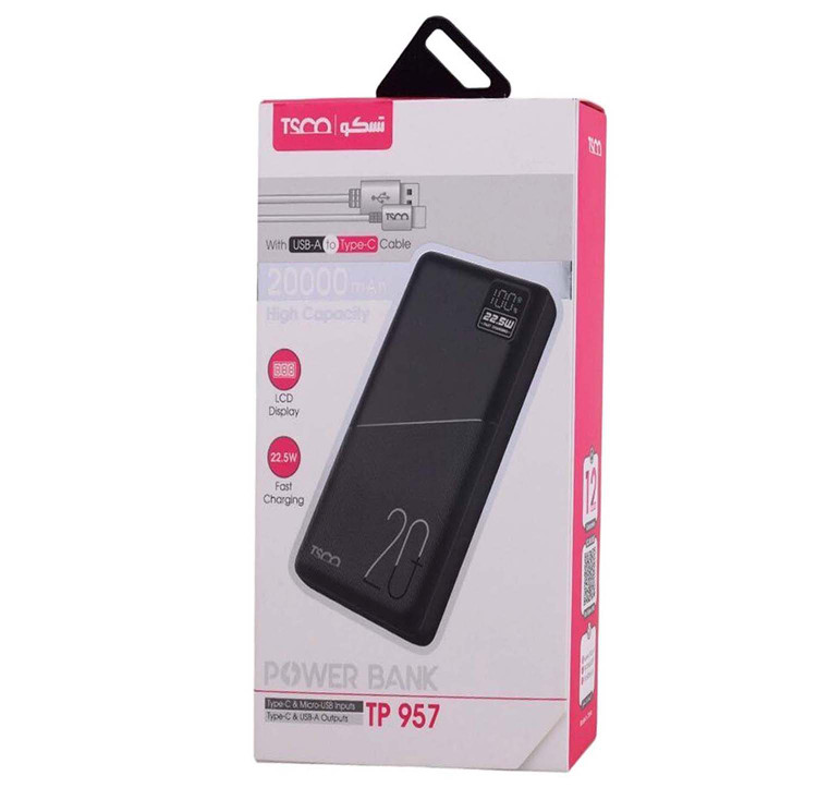 پاوربانک تسکو TP 957 از نظر فنی نیز یک گزینهی قدرتمند برای شارژ سریع و ایمن دستگاههای الکترونیکی محسوب میشود.دارای سه خروجی شامل یک پورت Type-C و دو پورت USB-A است.این تنوع باعث میشود که کاربران بتوانند همزمان سه دستگاه مختلف را شارژ کنند، بدون اینکه نیاز به حمل چندین شارژر داشته باشند. پورتهای USB-A این پاوربانک با حداکثر توان 22.5 وات، میتوانند گوشیهای هوشمند، تبلتها و سایر دستگاههای سازگار را با سرعت بالا شارژ کنند. خروجی Type-C این پاوربانک نیز میتواند با حداکثر توان 20 وات، گوشیهای جدید، تبلتها و حتی برخی لپتاپهای کوچک را شارژ کند. یکی از مزیتهای مهم TP 957 این است که برای شارژ خود دستگاه، دو ورودی MicroUSB و Type-C در نظر گرفته شده است. این طراحی به کاربران این امکان را میدهد که بر اساس کابل و شارژری که در دسترس دارند، یکی از این دو ورودی را برای شارژ پاوربانک انتخاب کنند.