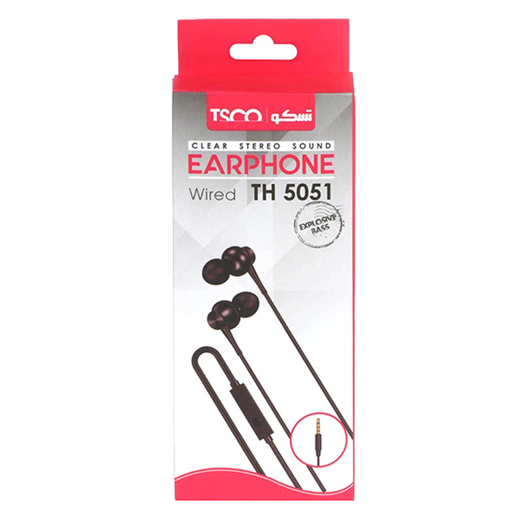 ایرفون «TH 5051» محصولی دیگر از TSCO است که جزو هدفونهای توگوشی یا ایرفون (Earphone) بهشمار میرود. به منظور استفاده از این محصول کافی است جک ایرفون 3.5 میلیمتری آن را به گوشی هوشمند خود متصل کرده و از تجربه گوش دادن به موسیقی لذت ببرید؛ با استفاده از این محصول به راحتی میتوانید به تماس های تلفنی خود پاسخ دهید و همچنین با استفاده از طول کابل 1.2 متری این محصول، استفاده از آن آسانتر شده و میتوانید به راحتی گوشی موبایل خود را درون جیب و یا کیف خود قرار دهید.