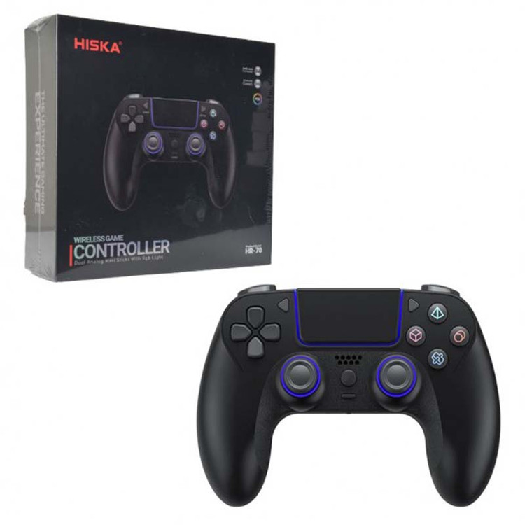 دسته بازی هیسکا مدل HR-70 دارای 2 موتور ویبراتور قدرتمند می باشد که لذت بازی کردن را چند برابر می کند. زبان طراحی و پیکربندی این دسته بازی از دوال شاک 4 سونی الگو میگیرد.همچنین دارای تاچ پد لمسی با قابلیت کلیک و پشتیبانی از موشن سنسور می باشد. ارگونومی خوب، نور زیر استیکها و قابلیت شوک.این دسته 20 دکمه شامل کلید جهت، دکمههای چهارگانهی سمت راست دسته، دکمههای OPTIONS، SHARE، TURBO و TOUCHPAD، دکمهی Home و همچنین دو دکمهی آنالوگ روی صفحهی دسته و چهار دکمه در قسمت بالایی آن است. همچنین چهار کلید اضافی برای عملکردهای MACRO, MAPPING در پشت دسته قرار دارد. حرکت روان دکمههای این دسته هم لذت بازی را برایتان بیشتر میکند و هم باعث میشود عملکرد بهتری در بازی داشته باشید. حرکت روان بازی در دکمههای آنالوگ دسته هم دیده میشود. این دکمهها علاوهبر حرکت روان، دوام بالایی دارند و حتی درصورت استفادهی زیاد کیفیت اولیهشان را حفظ میکنند. در قسمت زیر دکمههای آنالوگ یا شوکهای این دسته نورپردازی چند رنگی درنظر گرفته شده که باعث میشود دسته زیباتر و حرفهایتر بهنظر برسد. این دسته دارای اسپیکر داخلی ، سوکت 3.5 میلی متری هدست، باتری داخلی با ظرفیت 1000 میلی آمپر ساعت ، نورپردازی RGB و دارای روکش ضد تعریق و ضد لغزش می باشد که بتوانید به راحتی از آن استفاده کنید.