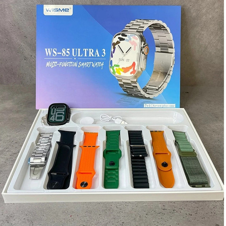 ساعت هوشمند Wisme مدل WS-85 Ultra3 با بدنه فلزی و سایز قاب 49 میلیمتر، دارای صفحهنمایش لمسی رنگی ~2.0 اینچ مستطیلی، مقاومت در برابر پاشش آب با استاندارد IP65، مجهز به 7 بند سیلیکونی و فلزی قابل تعویض، قابلیت مکالمه بلوتوثی با میکروفون و اسپیکر، اتصال از طریق بلوتوث 5.0 و 3.0 سازگار با اندروید و iOS، پشتیبانی کامل از زبان فارسی در منو و اعلانها، دارای سنسورهای سلامتی شامل ضربان قلب، فشار خون، اکسیژن خون، نوار قلب (ECG) و پایش خواب، امکاناتی نظیر کنترل موسیقی و دوربین، دستیار صوتی، Dynamic Island، ماشینحساب و واچفیسهای متنوع، باتری 320 میلیآمپر با شارژ وایرلس و شارژدهی تا 15 روز، به همراه 7 بند و شارژر وایرلسی ارائه میشود.