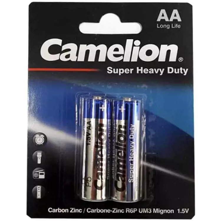 باتری قلمی کملیون AA مدل Super Heavy Duty بسته 2 عددی با ماندگاری و عمر طولانی، تولید شده بدون استفاده از مواد سمی کادمیوم و جیوه، ولتاژ باتری 1.5V مستقیم DC قابل استفاده در انواع وسایل الکترونیکی و.. تعداد باتری در پک: 2 عدد باتری نیم قلمی سایز AA مناسب انواع ساعت، ریموت کنترل، دوربین، موزیک پلیر و... میزان استفاده از مواد سمی کادمیوم و جیوه : 0%