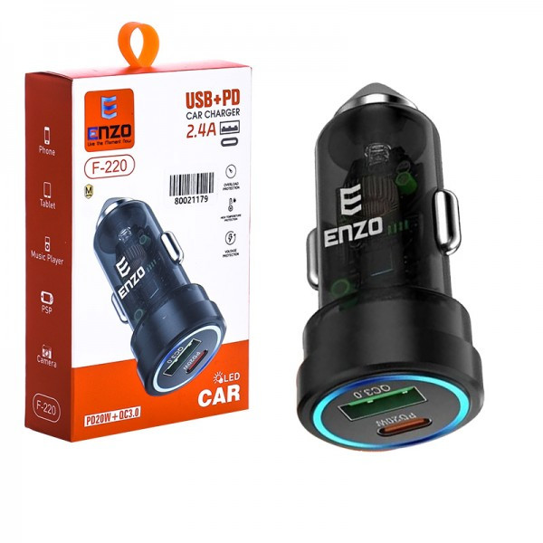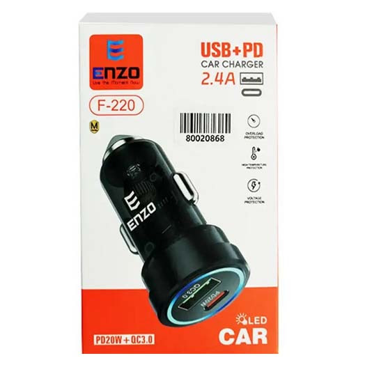 شارژر فندکی انزو مدل F-220 مجهز به یک درگاه خروجی Type-C و یک عدد پورت خروجی USB با توان خروجی 38 وات بوده و بدنه ساخته شده از پلاستیک با کیفیت، مقاوم در برابر صدمات فیزیکی همچون فشار و ضربه می باشد. مجهز به تکنولوژی PD با محدوده ولتاژ ورودی 12 الی 24 ولت و مقاومت بالا در برابر اتصال کوتاه و نوسانات جریان الکتریکی و مقاوم در برابر دمای بالا می باشد. این شارژر دارای نورپردازی حلقه ای به رنگ آبی می باشد.