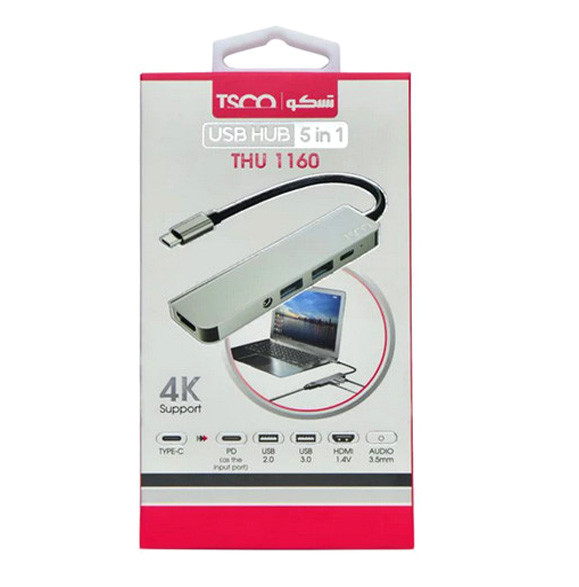 THU 1160 از سیستمعاملهای متعددی چون ویندوز 10، مک او اس، آی پد او اس، اندروید و لینوکس پشتیبانی میکند و از این نظر یک مبدل با کیفیت است. هاب تسکو مدل THU 1160 یک اتصال امن و ساده در اختیار شما میگذارد تا بتوانید اتصال راحتی بین گوشی، حافظه جانبی و کامپیوترتان برقرار کنید. این مبدل مینیمال میتواند همزمان هم شاژر و هم دیتا انتقال بدهد. در نتیجه شما میتوانید بدون قطع کردن هیچ یک از اتصالات به کار خود ادامه دهید. در ساخت بدنه این هاب از آلومینیوم با کیفیت و پلاستیک فشرده ABS استفاده شده است. هم چنین این هاب در ابعاد 104x27.96x10.22 میلی متر ساخته شده وزنی سبک و طراحی ظریف و شیک دارد. طراحی ساده این هاب، جلوه مینیمال، ساده و تمیزی به میز کار شما میبخشد. THU 1160 یک پورت USB نسل سه و یک پورت USB نسل 2 در اختیار شما میگذارد. علاوهبر آن یک یک پورت HDMI با قابلیت انتقال تصاویر و ویدیو های 4k، جک سه و نیم میلیمتری صدا و یک پورت میکرو یو اس با تکنولوژی PD دارد. با کمک این پورت USB هم میتوانید دیتا جا به جا کنید و هم اگر نیاز شد، دستگاه متصل به هاب را شارژ کنید. پورت Type-C این دستگاه میتواند به عنوان ورودی منبع تغذیه دستگاه هم استفاده شود و زمانی که شما نیاز به توان ورودی بیشتری دارید شما را بی نیاز می کند. تکنولوژی این پورت قابلیت Power Delivery (PD) را به شما می دهد و جریان ورودی تا 80W را پشتیبانی خواهد کرد