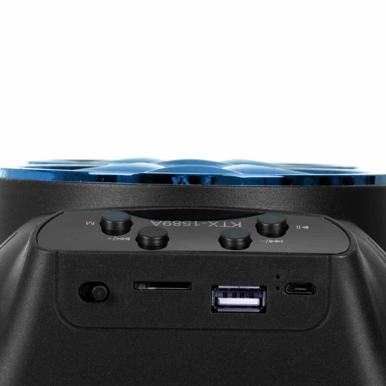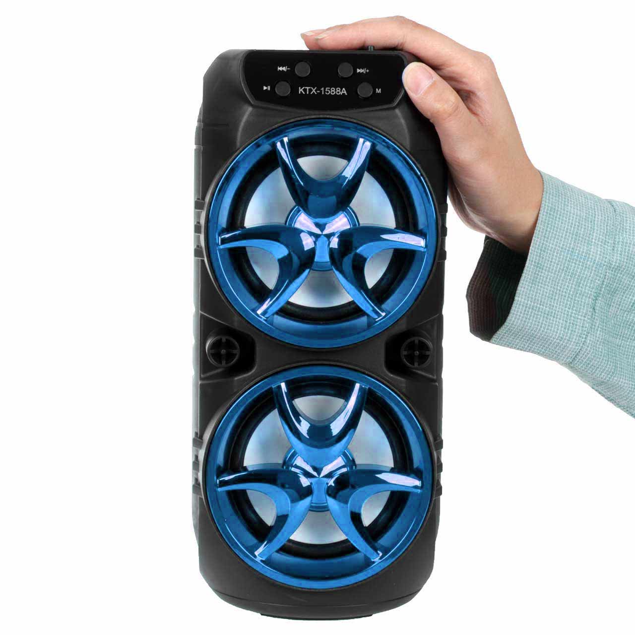 اسپیکر مدل KTX 1588A با داشتن دو بلندگوی 3 اینچی با ابعاد 10*10*25 سانتی متر ، یک پرتابل اسپیکر با وضوح صدای مناسب برای مکانهای کوچک است که با ابعاد و وزن مناسبی که دارد قابلیت جابجایی راحت و استفاده در مکان های مختلف را برای شما فراهم میکند تا بتوانید از طریق بلوتوث / مموری کارت و یا فلش موزیک دلخواهتان را اجرا کنید و از شنیدن صدای آن لذت ببرید. داخل هر دو باند این اسپیکر چراغهای LED رنگی قرار دارد که زیبایی بیشتری به این اسپیکر می بخشد. باطری 1200 میلی آمپر اسپیکر تا بیش از 3 ساعت پخش موزیک با صدای بلند را برای شما فراهم میکند و برای شارژ کامل باطری 2ساعت زمان نیاز دارد. این اسپیکر رادیو FM هم دارد که به کمک دکمه ها باید موجهای رادیو بصورت خودکار فعال شود.