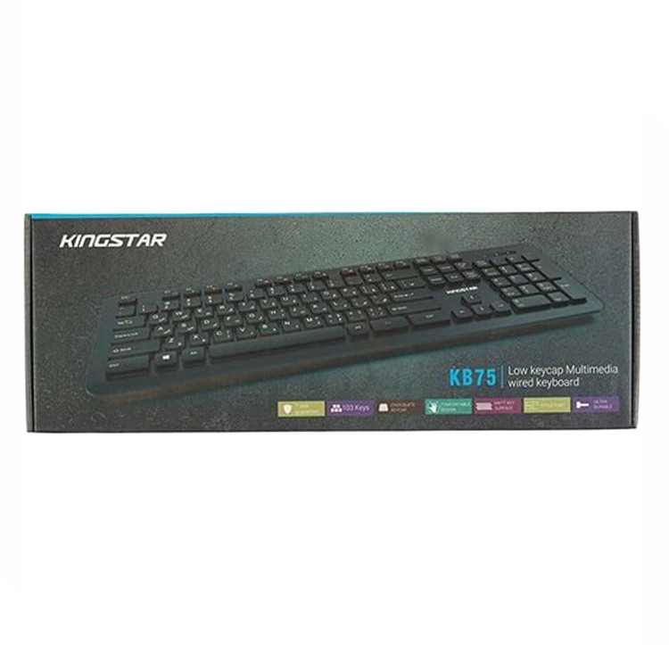 کیبورد کینگ استار مدل kb75 از نوع بی سیم میباشد و از طریق دانگل USB به کامپیوتر متصل میشود. این کیبورد دارای 103 کلید برای انجام فعالیتهای کامپیوتری است. همچنین کیبورد kb75 دارای 20 کلید میانبر به منظور انجام سریعتر کارهاست که عبارتند از Music, Volume +-, Nex Track, Pre. Track, Play/Pause, Stop, Web Home, email, My Computer, Favorite. کیبورد کینگ استار مدل kb75 برای استفادههای روزمره مناسب میباشد. از دیگر ویژگیهای این کیبورد محصول کمپانی کینگ استار، طراحی کلیدها به گونهای که امکان تایپ کردن در مدت زمانی طولانی را فراهم می کند، دسترسی راحت به تمامی کلید های کاربردی، طراحی نرم و سایلنت کلید ها، با دوام و دارای کلید های مات میباشد.