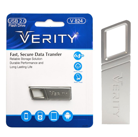 فلش مموری 64 گیگ VERITY مدل V 824 دارای اندازه کوچک و سبک می باشد. این فلش دارای بدنه ای فلزی و دارای بند آویز حلقه ای مانند جهت اتصال به دسته کلید و راحتی در حمل و نقل و محافظت در نگهداری و گم شدن میباشد. فلش مموری V 824 با درگاه USB 2.0 از سرعت مناسبی برای نمایش و انتقال اطلاعات میان سیستم ها، تماشای فیلم در نمایشگر ها، گوش دادن به موسیقی در پلیرها و … بهره می برد و می توان از آن در تمامی سیستم عامل های ویندوز و مک که دارای درگاه USB باشند استفاده کنید.