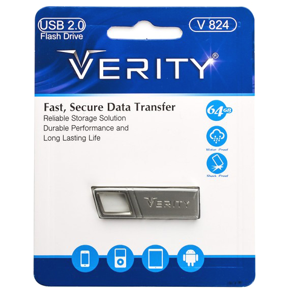 فلش مموری 64 گیگ VERITY مدل V 824 دارای اندازه کوچک و سبک می باشد. این فلش دارای بدنه ای فلزی و دارای بند آویز حلقه ای مانند جهت اتصال به دسته کلید و راحتی در حمل و نقل و محافظت در نگهداری و گم شدن میباشد. فلش مموری V 824 با درگاه USB 2.0 از سرعت مناسبی برای نمایش و انتقال اطلاعات میان سیستم ها، تماشای فیلم در نمایشگر ها، گوش دادن به موسیقی در پلیرها و … بهره می برد و می توان از آن در تمامی سیستم عامل های ویندوز و مک که دارای درگاه USB باشند استفاده کنید.