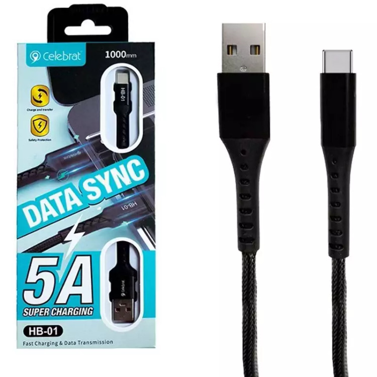 کابل فست شارژ HB-01 تولید شرکت سلبریت می باشد و طراحی ظریفی دارد این کابل 100 سانتیمتر طول دارد و با انواع گوشیهای موبایل، تبلت، دوربینهای دیجیتال و دیگر لوازم مجهز به درگاه USB-C سازگار است. در یک سمت از این کابل یک کانکتور USB-C و در سمت دیگر آن یک کانکتور USB به کار رفته است. شما میتوانید کانکتور USB موجود در این کابل را به یک دستگاه مجهز به این درگاه مانند کامپیوتر یا لپتاپ متصل کنید؛ سپس سمت دیگر کابل را به تبلت یا گوشی موبایلتان وصل کرده و اطلاعات را میان آنها انتقال دهید. همچنین این امکان وجود دارد که کانکتور USB کابل را به یک شارژر دیواری متصل کرده و باتری گوشی موبایل یا تبلت خود را شارژ کنید همچنین میتوان از آن بهعنوان کابل یدک مخصوص استفاده برای شارژر فندکی و پاوربانک استفاده کرد. رشتههای مسی داخل این کابل با روکشی از جنس PVC و سیلیکون پوشانده شدهاند. این روکش مقاوم است و باعث میشود کابل در برابر گره خوردن یا درهم پیچیدن مقاومت زیادی داشته باشد. سرعت انتقال اطلاعات و شارژ در این محصول به صورت فست شارژ می باشد.