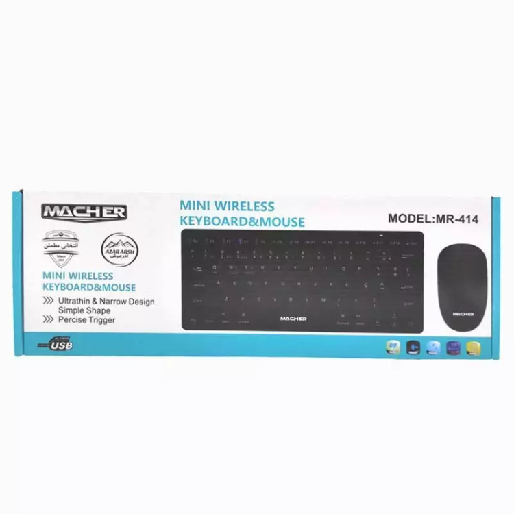 ست کیبورد و ماوس بی سیم مچر مدل MR-414 بهره مند از یک نشانگر LED جهت آگاهی از وضعیت شارژ باتری موفق به کسب استاندارد های سلامت فیزیکی محصول CE و RoHS کیبورد دارای 78 عدد کلید فیزیکی با حروف فارسی حک شده بر روی آن طراحی شده به صورت ارگونومیک جهت جلوگیری از خستگی دست کاربر منبع تغذیه کیبورد یک عدد باتری AA، منبع تغذیه موس یک عدد باتری AA نحوه اتصال ماوس و کیبورد به سیستم توسط دانگل USB به صورت بی سیم بدنه ساخته شده از متریال پلاستیک با کیفیت، مقاوم در برابر فشار و ضربه احتمالی موس شامل 3 کلید، مجهز به حسگر از نوع اپتیکال، فرکانس بی سیم موس 2٫4 گیگاهرتز