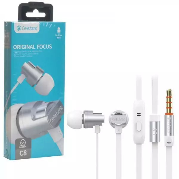 هندزفری اصلی سیم دار سلبریت Celebrat C8 دارای کیفیت صدای شفاف و بینظیر مناسب جهت استفاده روزمره ، پیاده روی ، گیمینگ و ورزش میباشد که در رنگ های متنوعی تولید شده است هندزفری سلبریت C8 دارای میکروفون با کیفیت جهت برقراری تماس دارد و همچنین برای سهلوت استفاده کلید پاسخ و قطع کردن تماس در کنار میکروفون تعبیه شده است. رابط جک هندزفری 3.5 میلیمتری آن سازگار با انواع دیوایس ها مانند گوشی موبایل ، تبلت ، لپتاپ ، Mp3 و غیره میباشد. سیم و کابل هندزفری از نوع فلت یا تخت میباشد و از متریال با کیفیت ساخته شده که در برابر کشش و پارگی مقاوم است. طول سیم هندزفری سلبریت 120 سانتی متر میباشد.