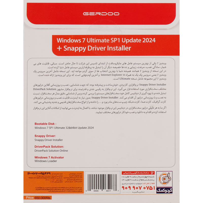 نوع دیسک: DVD9 ویندوز 7 سرویس پک 1 در دو ویرایش 32 و 64 بیتی با آخرین آپدیت ها به همراه قدرتمندترین نرم افزار درایور پک جهت شناسایی و نصب خودکار درایورهای سیستم اتوران اختصاصی گردو به همراه راهنمای نصب فارسی