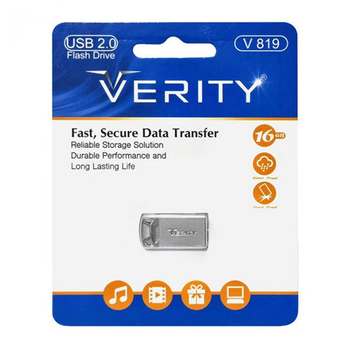 فلش مموری وریتی مدل V819 ظرفیت 16 گیگابایت با بدنه فلزی در برابر آب، شوک و لرزش مقاومت دارد و اگر در معرض آن ها قرار بگیرد اطلاعات داخل آن آسیب نمیبیند یا از دست نمی رود. برند وریتی، یک برند انگلیسی است که دفتر این شرکت در لندن بوده اما خط تولید و کارخانجات آن در چین قرار دارد، این کمپانی در زمینه تولید انواع باتری، فلش، رم و تجهیزات جانبی دیجیتال فعالیت می کند. این فلش مموری با سیستم عامل های Windows ،macOS ،Linux ،Android سازگاری دارد.